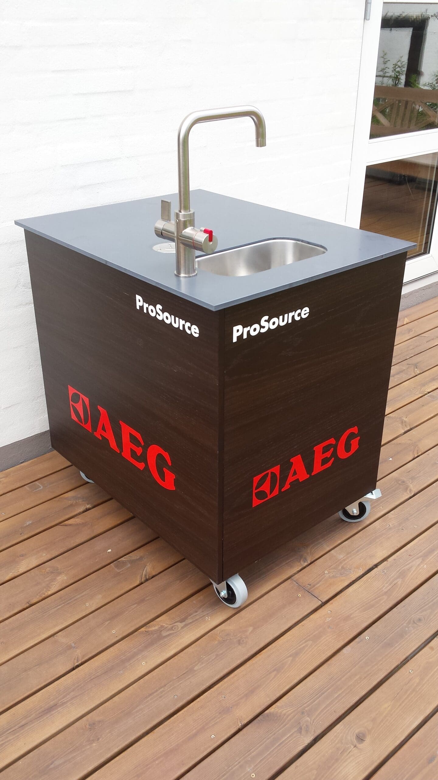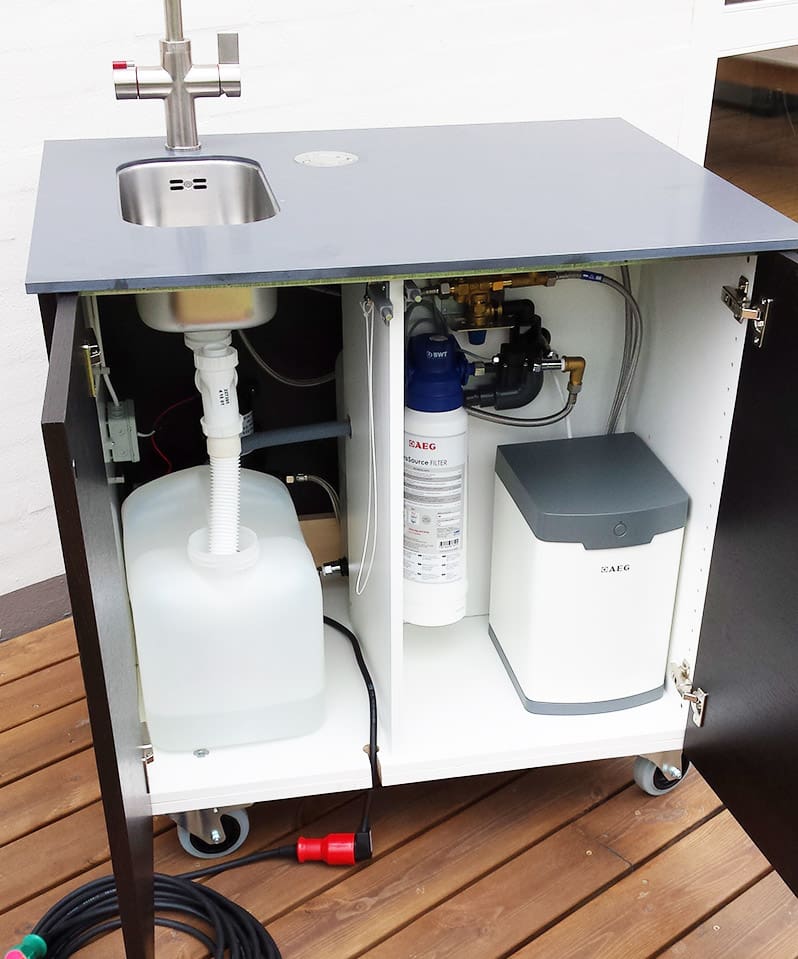 – Til tider findes der ganske enkelt ikke en færdig løsning, der blot kan bestilles i et katalog. Så må vi på værkstedet og have fat i sav, høvl og sandpapir, for at konstruere lige det kunden efterspørger. Det ligger os heldigvis ikke så fjernt, her er et eksempel på hvad sådan en opgave kan føre til. Tre styk mobile køkkenskabe med vandhane til kogende vand samt egen transportkasse, så de kan komme rundt i Europa.